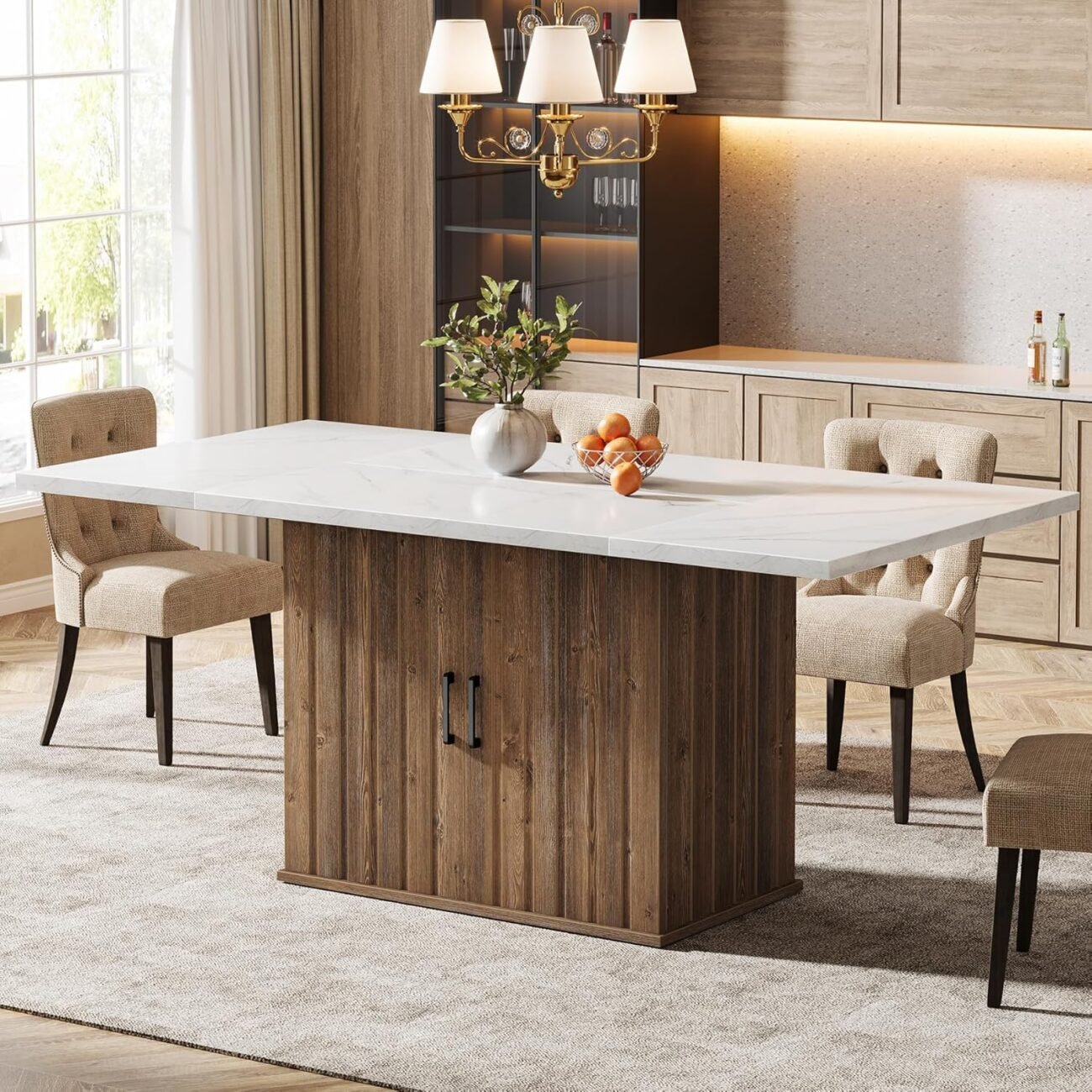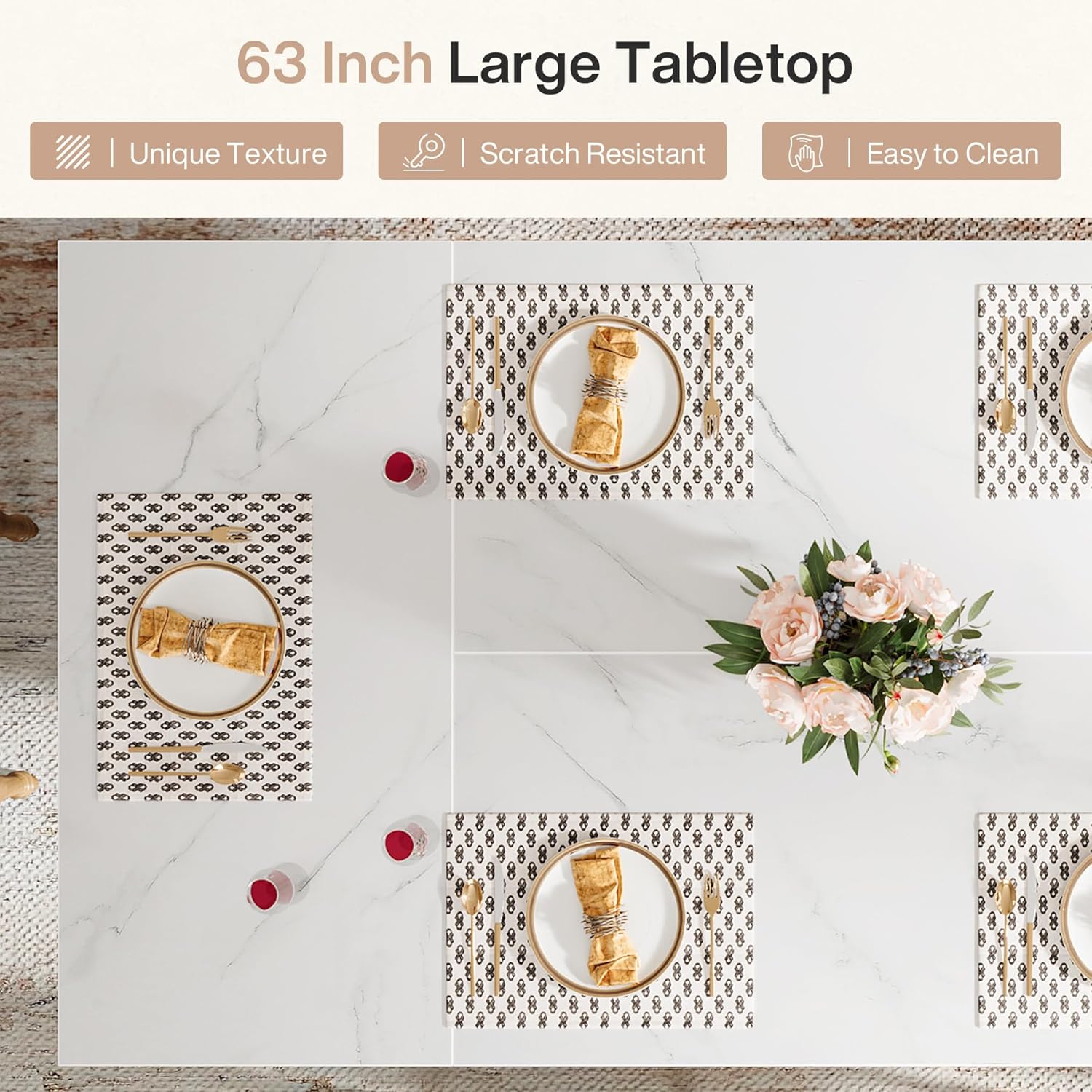 The Tribesigns 63" Dining Table offers a stylish combination of functionality and elegance, making it an attractive centerpiece for any dining area while serving practical needs. With a faux marble tabletop paired with a sturdy cabinet base, it is designed to support gatherings ranging from intimate family dinners to lively meal parties among friends.